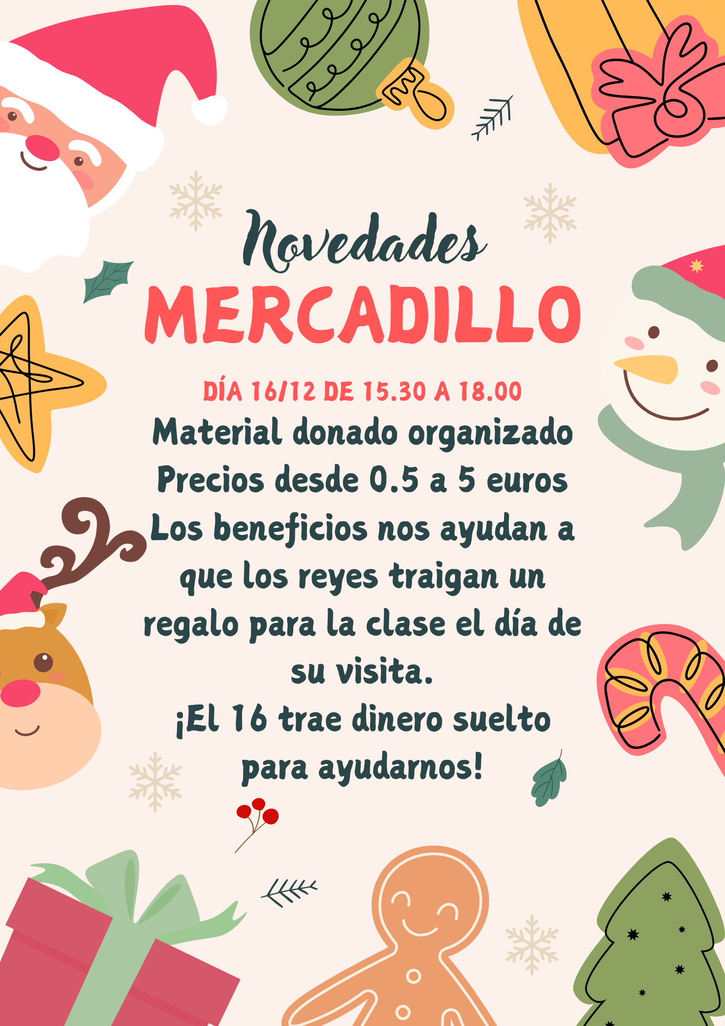 Por un lado, hemos organizado un mercadillo para el que hemos solicitado a las familias que donen juguetes, cuentos y todo lo relacionado con la infancia (excepto prendas) que no usen y en buen estado, y con lo recaudado hemos ayudado a los Reyes Magos a llevar un regalito a cada clase el día de su visita real. Además, con cada compra se entregaba una papeleta para una rifa el día de la fiesta de navidad en la escuela.